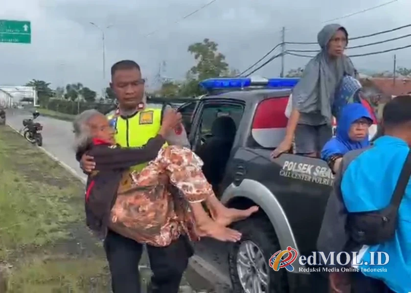 Aparat Polisi saat melakukan Evakuasi menggendong seorang Lansia yang terjebak Banjir di Pait, dengan kondisi Stroke, Sabtu (17/1/26).Kapolsek Sragi AKP Turkhan, S.H yang ikut langsung mengevakuasi memastikan seluruh warga rentan menjadi prioritas utama tim gabungan di lapangan.