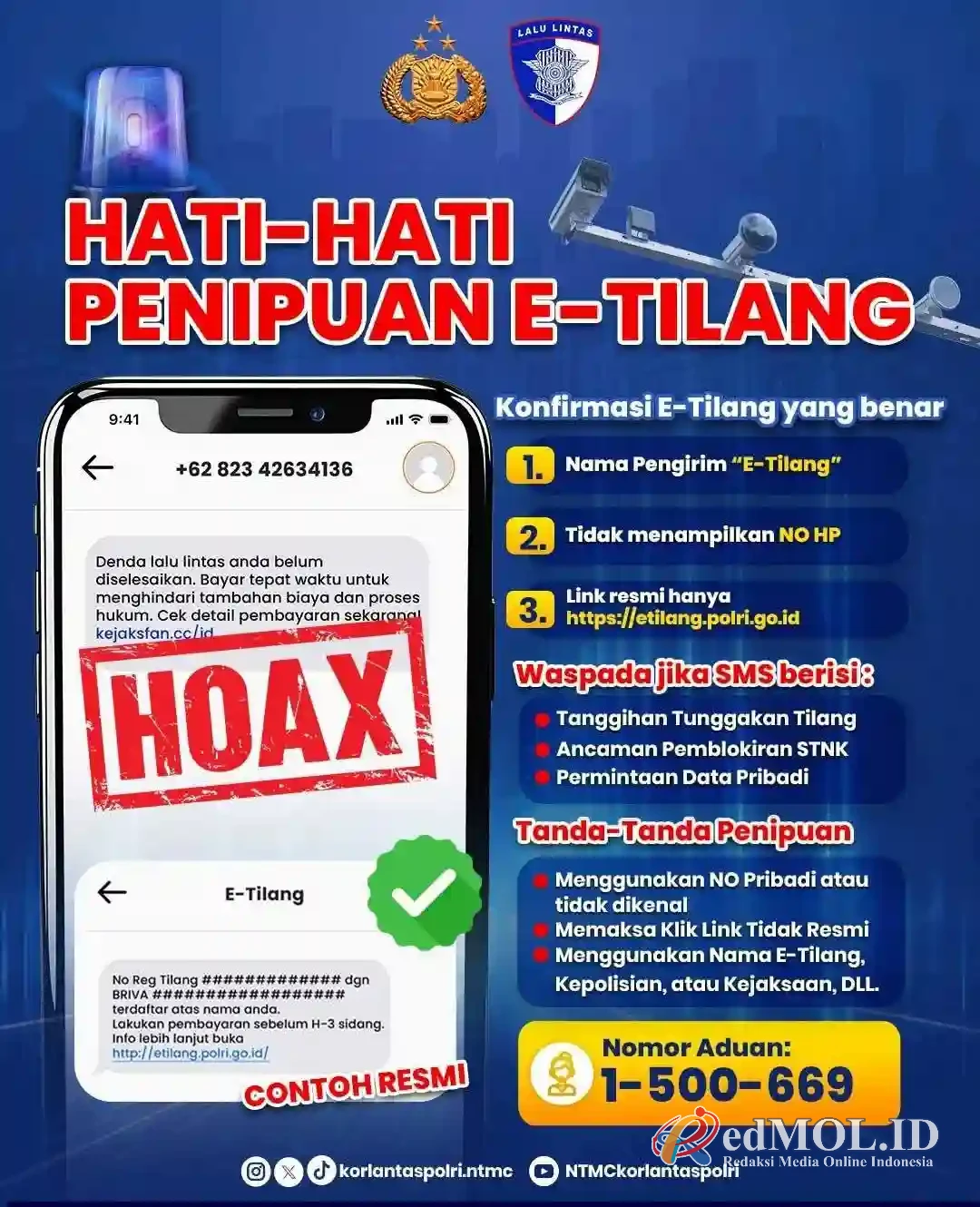 Maraknya pesan singkat melalui SMS maupun WhatsApp berisi tagihan denda ETLE dengan tautan (link) tidak resmi akhir-akhir ini memicu keresahan masyarakat. Menanggapi hal tersebut, Polda Jawa Tengah meminta masyarakat untuk lebih waspada terhadap modus penipuan atau phising yang mengatasnamakan institusi kepolisian.